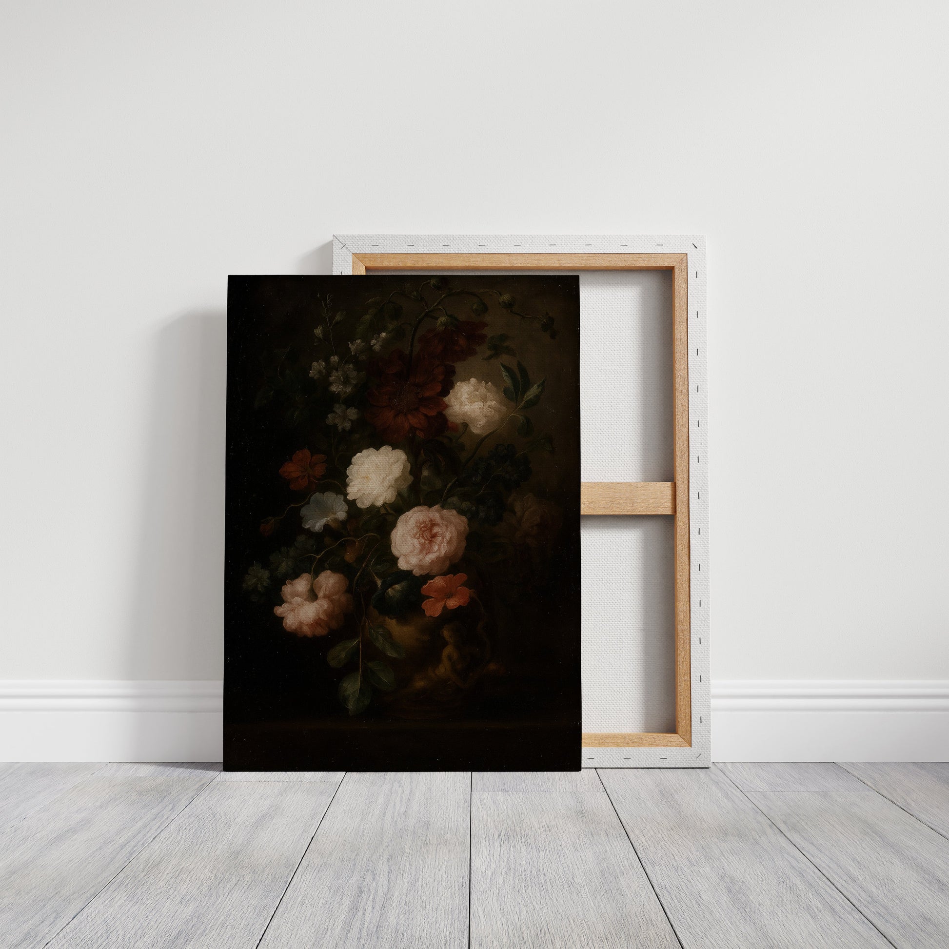 This giclée artwork is a study in Chiaroscuro—the dramatic collision of light and shadow. Executed in the grand tradition of the Dutch Golden Age, it features lush blooms of blush, creamy white, and deep crimson emerging from an almost black void.