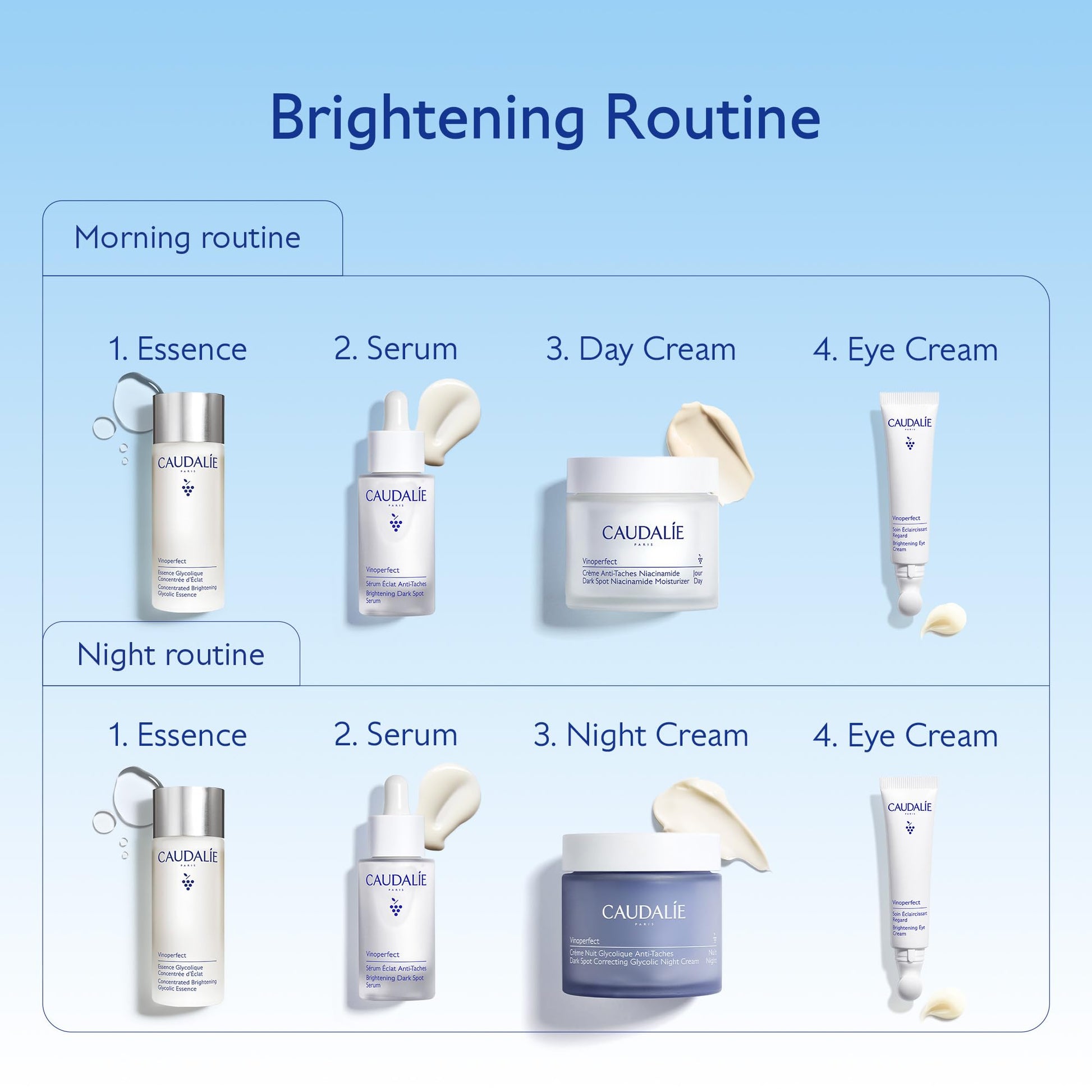 - YOUR BRIGHTENING ROUTINE: Apply the Brightening Moisturizer in the morning to the face and neck, alone or after your Vinoperfect Serum. Avoid the eye contour. For nighttime application, opt for the Vinoperfect Glycolic Night Cream.