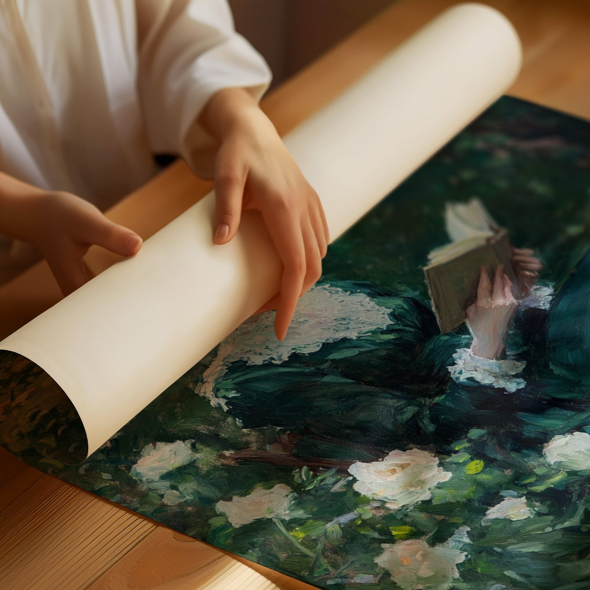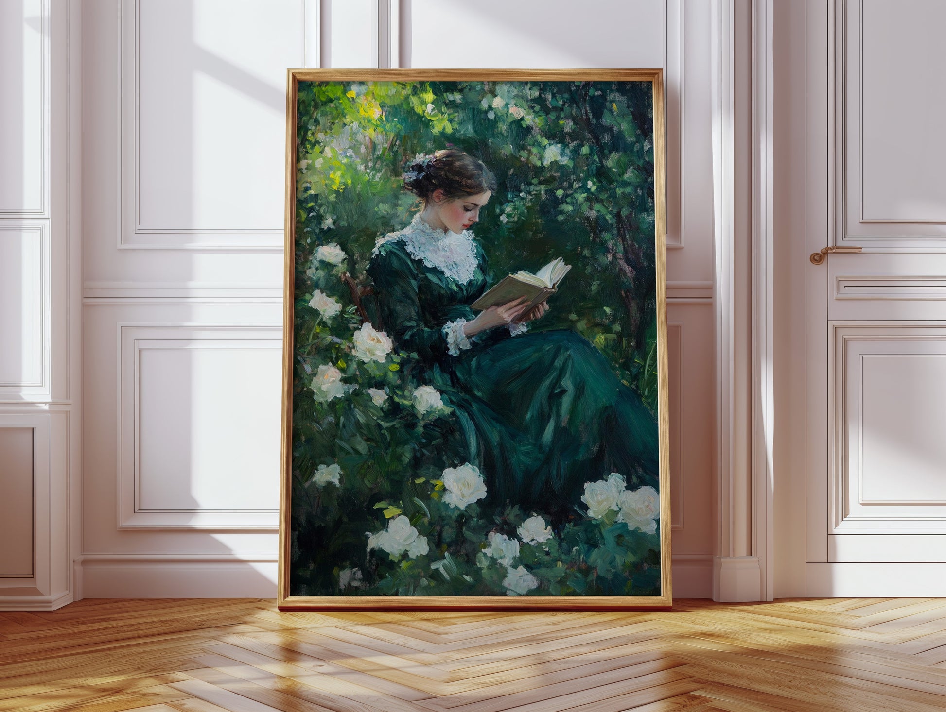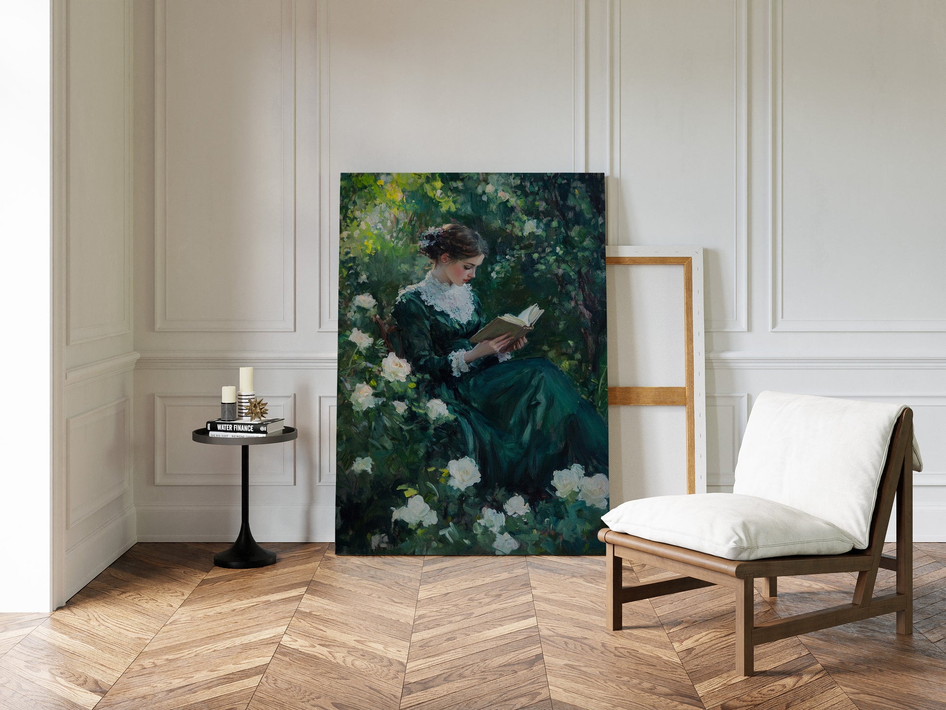 This giclée artwork captures the essence of that retreat. It depicts a young woman in a structured emerald dress, absorbed in a book amidst a secluded garden of white roses. It is a portrait of total absorption—the moment when the reader leaves the physical world and enters the intellectual one.