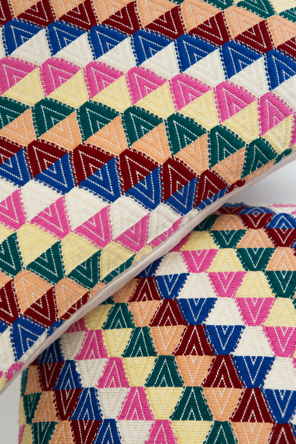 The pattern represents a traditional motif from Nahuala, a village in the highlands of Guatemala. This motif is known as the "Universe Pillow" because it symbolizes the universe in Maya hand-weaving tradition. It is the perfect colorful patterned pillow for a space that demands both visual cheer and deep meaning.