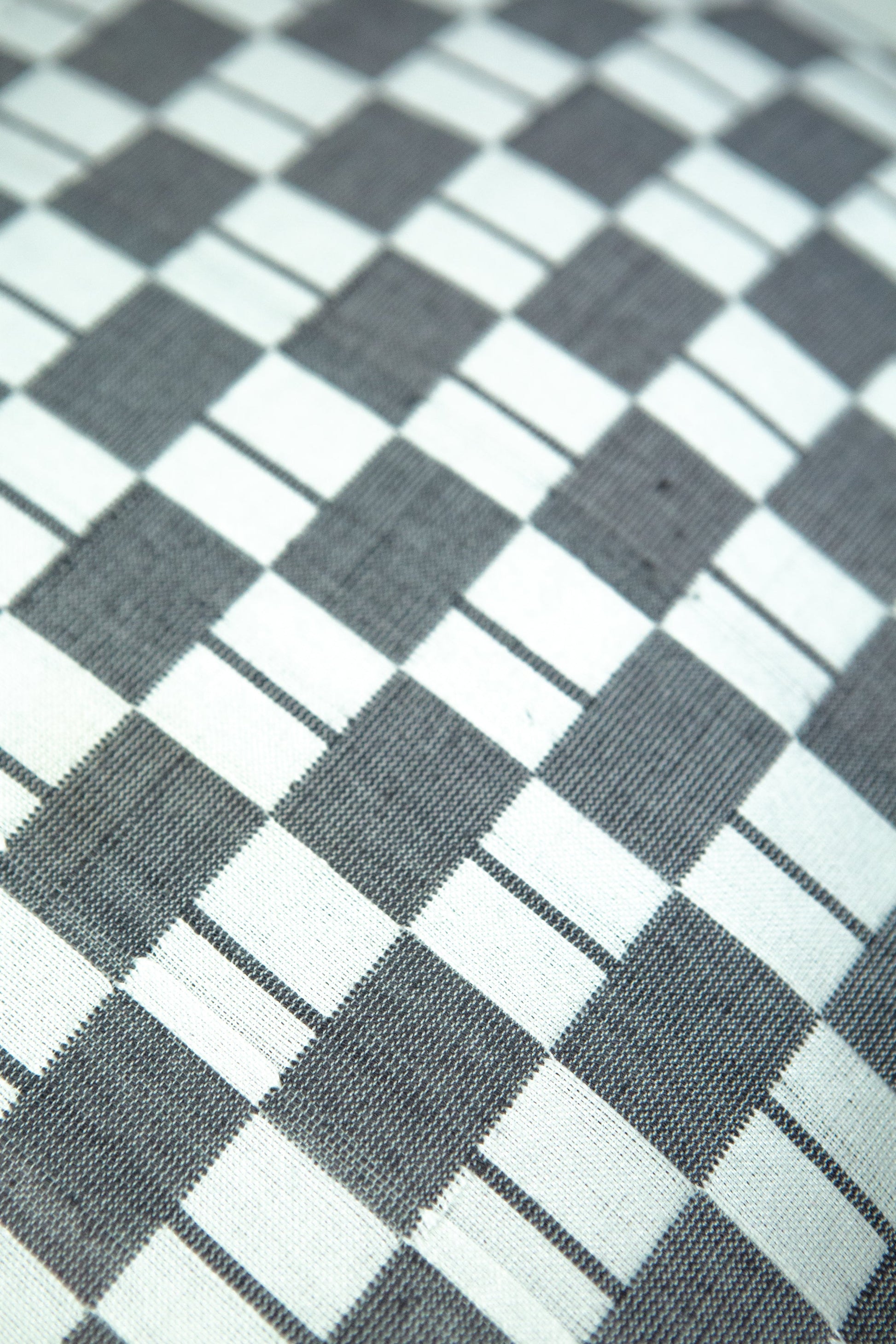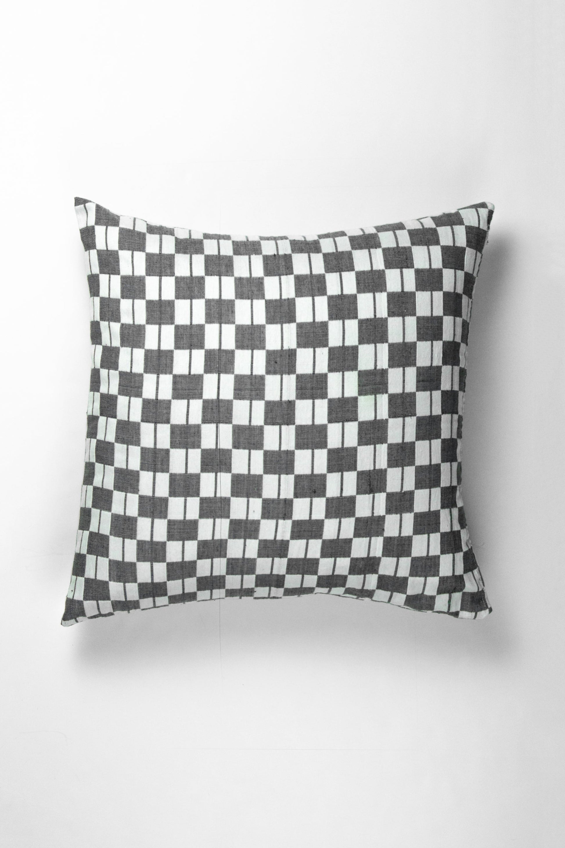 This pillow is an acquisition of an endangered textile art form. The material is meticulously crafted using a handwoven double-weave technique, a specialized style that originated in Gujarat, India, dating back to the 1860s.